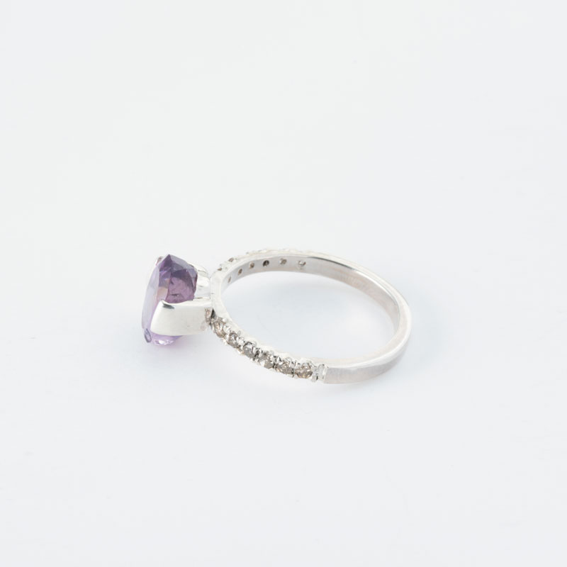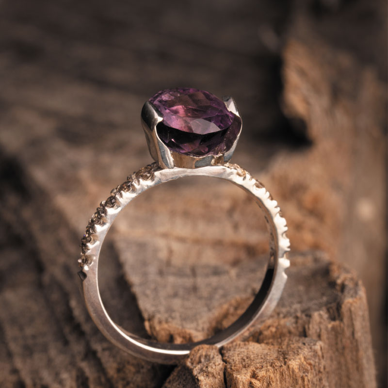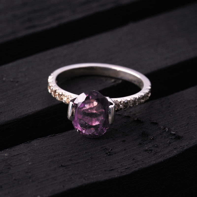 نگین آمیتیست 2 قیراطی این انگشتر که از معادن تایلند استخراج شده است و در ابعاد 7*9 میلیمتر به صورت چندوجهی تراش خورده، گوهرهای پاک و بنفش رنگ است که تصویری تماشایی از دشت گل گاو زبان رامسر را نمایش میدهد.