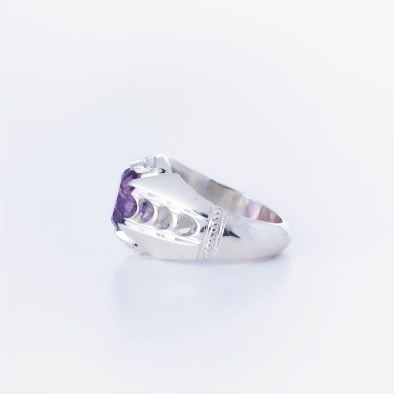 نگین آمیتیست 4 قیراطی این انگشتر که به صورت چندوجهی تراش خورده است، گوهرهای پربها از معادن تایلند است که رنگ بنفش آن جلوه دلپذیری به این اثر بخشیده است.