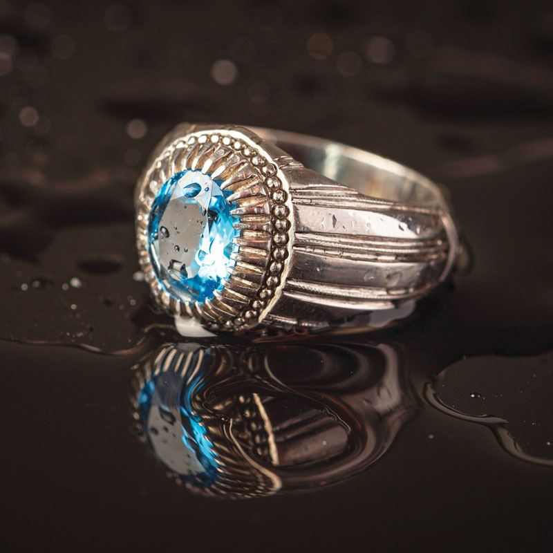 نگین این انگشتر، توپاز آبی سوئیسی با وزنی حدود 3 قیراط است که از گنجینه معادن نیجریه بیرون آمده و در دستان سنگ‌تراش، چنان به صورت چندوجهی تراش خورده که پرده از رخ بی‌همتای این سنگ برداشته است.