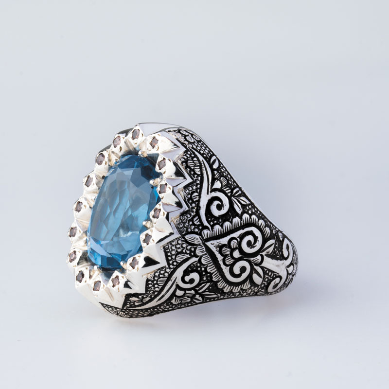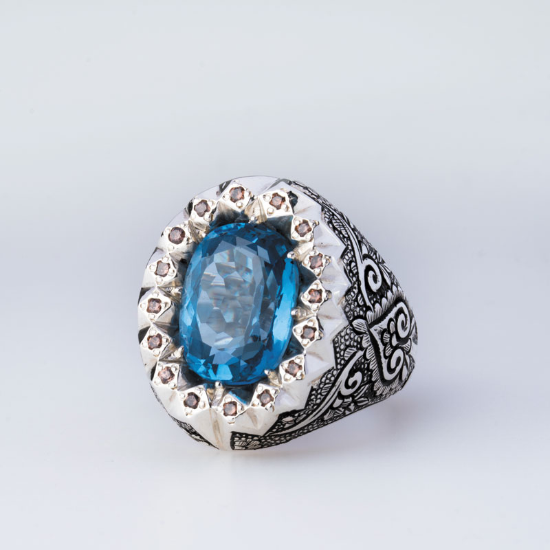 نگین توپاز 8 قیراطی این اثر که در ابعادی درخور و قابل توجه به صورت چندوجهی تراش خورده است، گوهرهای زیبا از معادن افریقا است که رنگ آبی زیبایش به مثال چشمهی زرین گل است.