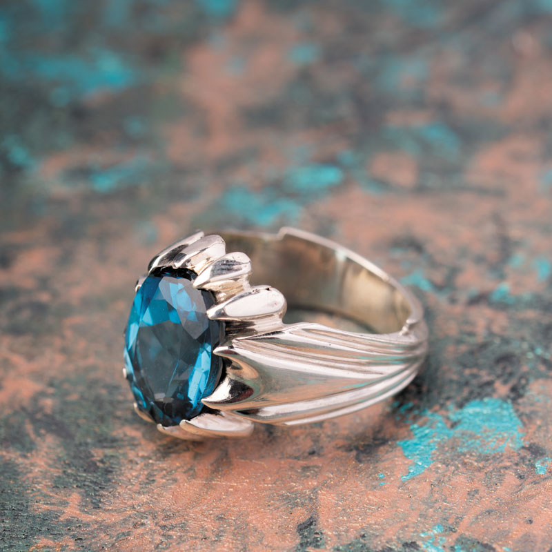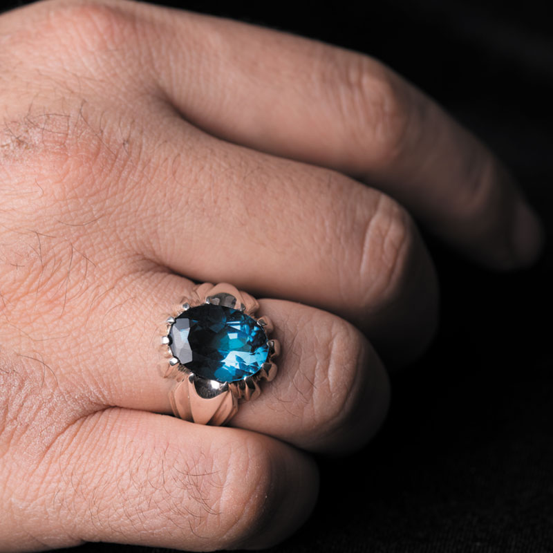 رکاب فیلی این انگشتر که هلالهای زیبا بر بدنه آن چکش خواری شده، جلوهای بدیع را برای آقایان به تصویر کشیده است. از سوی دیگر نگین درشت و قوارهدار توپاز آبی لندنی این انگشتر، آن را برازنده دست آقایانی کرده است که به نگینهای درشت علاقه دارند.