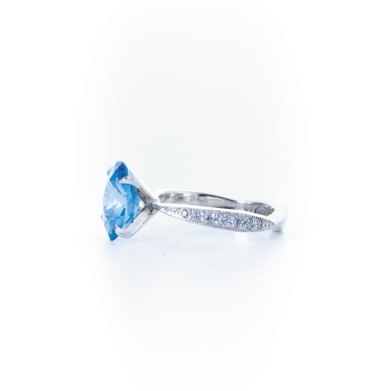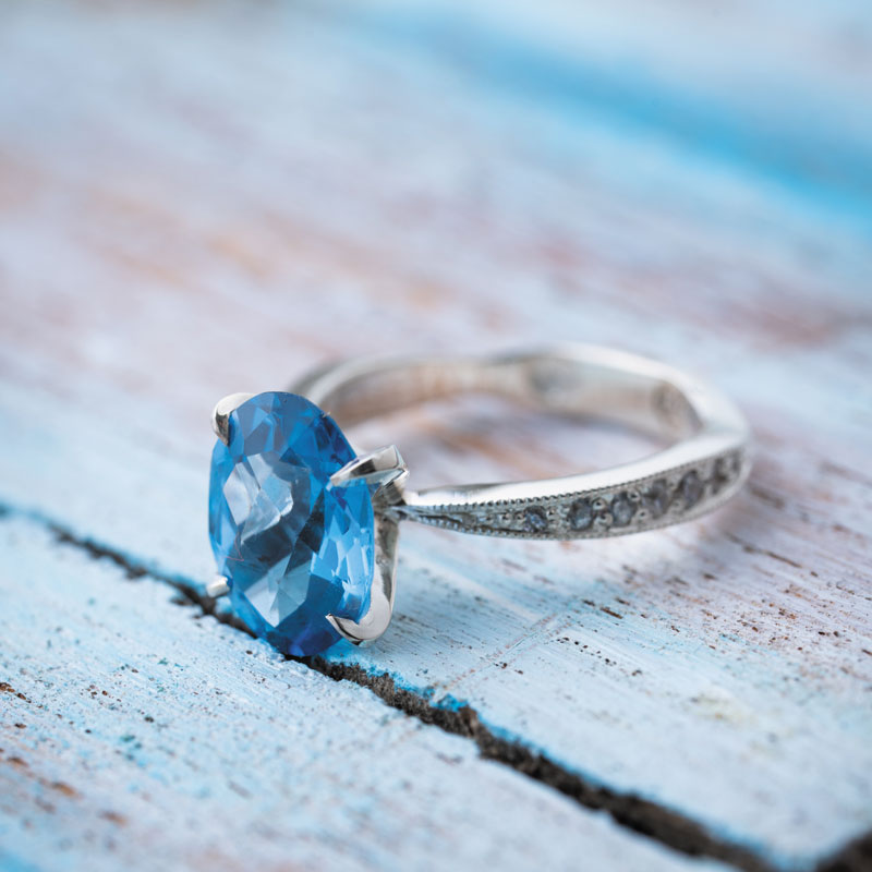 نگین این انگشتر، توپاز آبی سوئیسی با وزنی حدود 2.5 قیراط است که حاصل استخراج از معادن نیجریه است و تراش چندوجهیاش، شفافیت و زیبایی آن را دوچندان ساخته است.