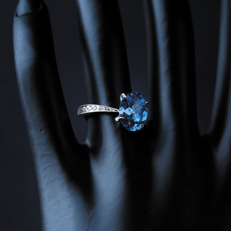 نگین آبی سوئیسی انگشتر توپاز لزور که بهشتی کوچک و جادویی را از بلندای 4000 متری زمین برای خانمها به تصویر میکشد، تمثالی زیبا است که در میان 14 الماس اصل که بر بدنه رکاب جاخوش کرده است، خوش میدرخشد.