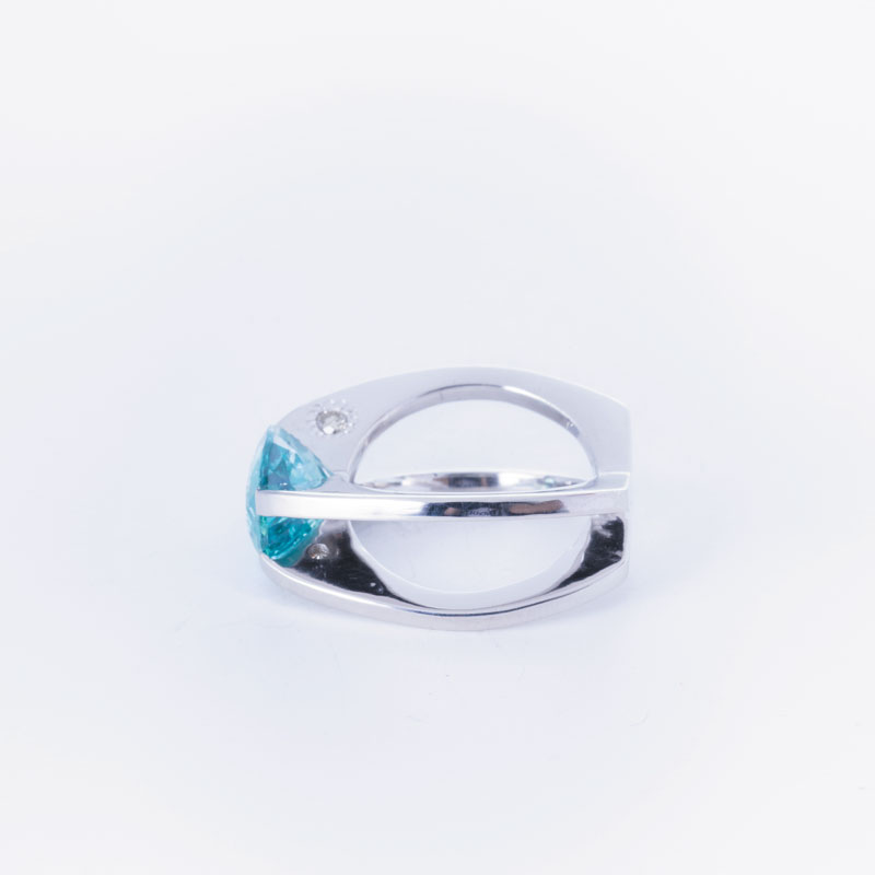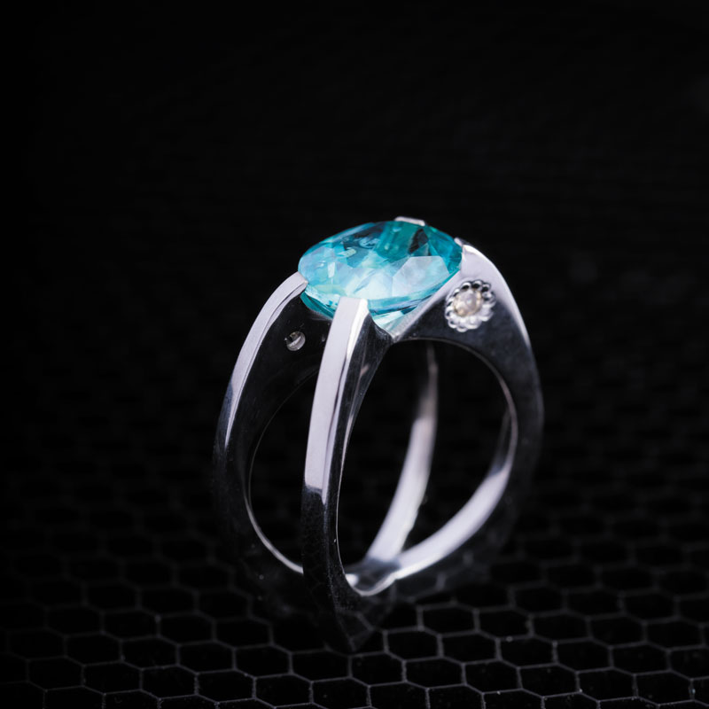 نگین توپاز این انگشتر که در وزن 3 قیراط به صورت چند وجهی تراش خورده است، گوهرهای پاک از افریقا است که با ابعاد در خور توجهی تراش خورده است و رنگ آبی آن، شباهت زیادی به چشمههای جای گرفته در بطن کوهستان بکر هماگ دارد.