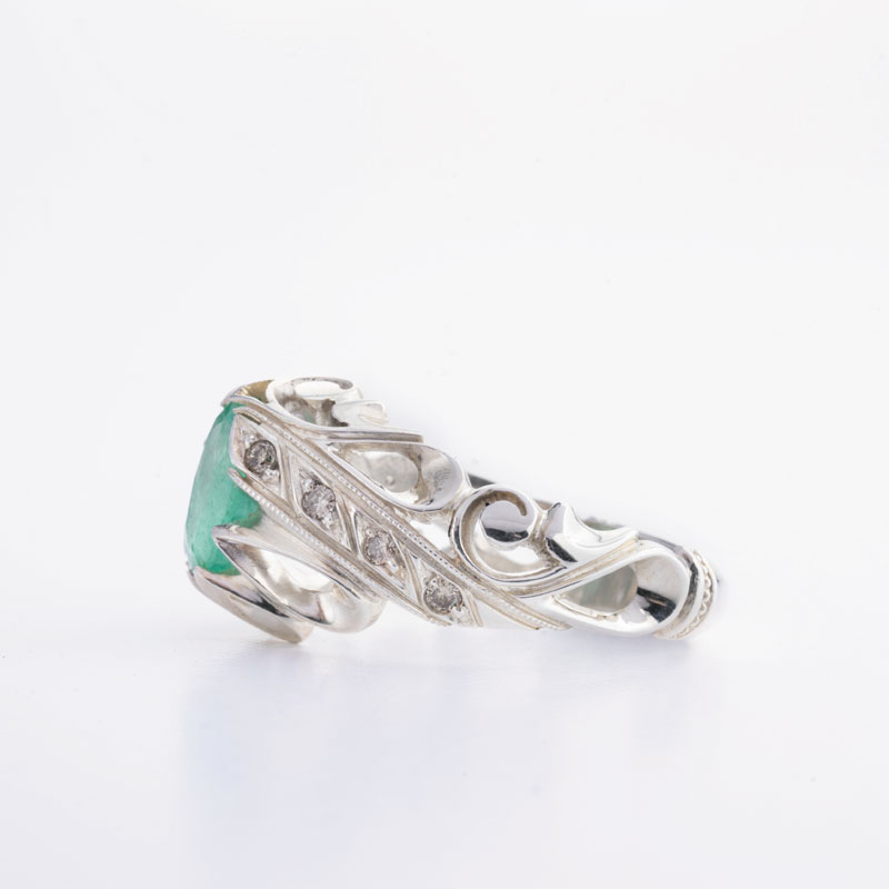 در این انگشتر زیبا، هنرمندان مجموعه جواهرات شرافت با به کار گیری مدل فیلی، نگین سبز زمرد را در میانه رکاب دستساز نقره جای داده و با جانشانی 8 الماس اصل در بدنه رکاب، شکلی بینظیر را به تصویر کشیده است که در ادامه به بررسی زوایای مختلف این انگشتر اصیل خواهیم پرداخت.