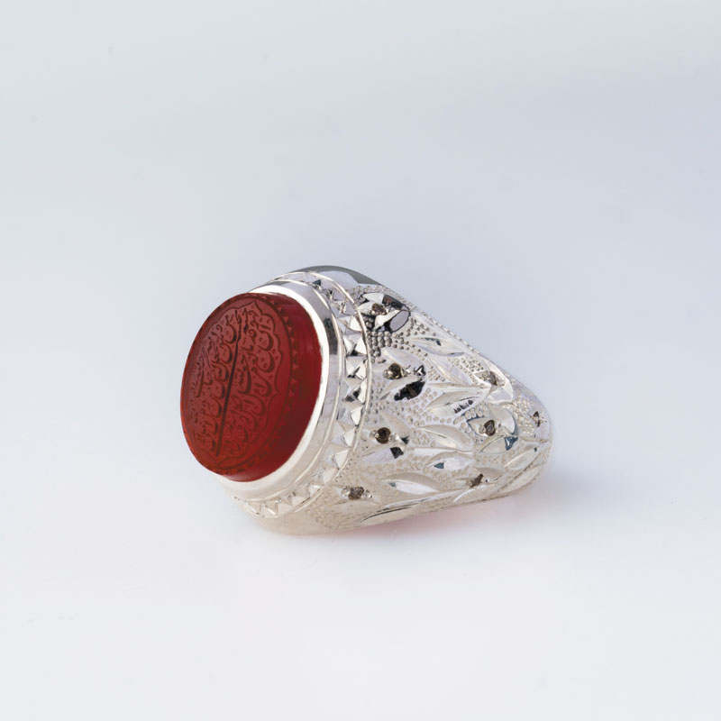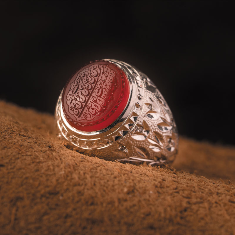 نقش متبرک این انگشتر روی عقیق سرخ رنگ، جلوهای از هنر ایرانی است که نگاه آقایان را با خود همراه کرده است و بسیار مورد علاقه کسانی است که علاقه دارند نقش حک شده بر نگین انگشترشان محافظ آنها در زندگیشان باشد.