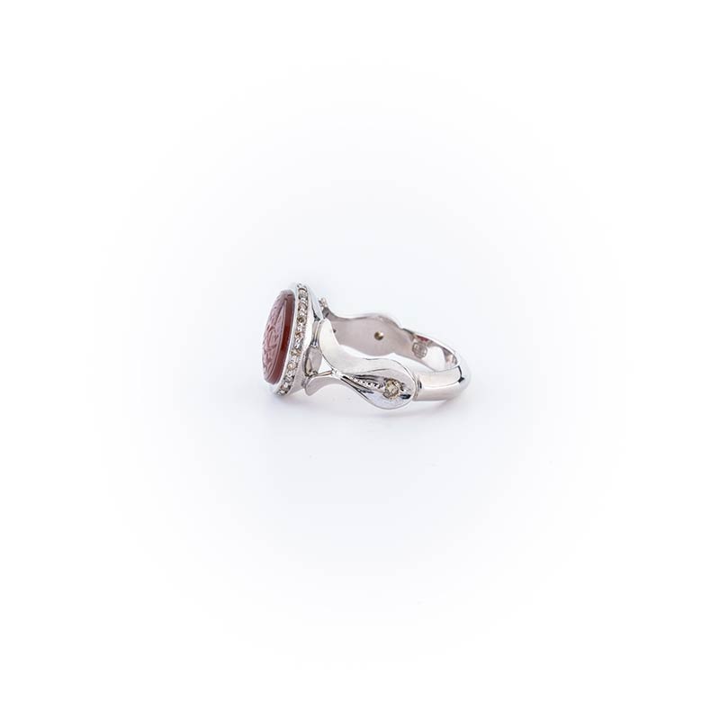 رکاب این انگشتر از نقره ۹۵ درصد ساخته شده و با ظرافتی کمنظیر در مدل فیلی، طراحی شده است. وجود ۲۵ الماس اصل گرداگرد نگین، جلوهای لوکس و درخشان به آن بخشیده و تضاد زیبای نقره و سرخی عقیق را دوچندان کرده است.