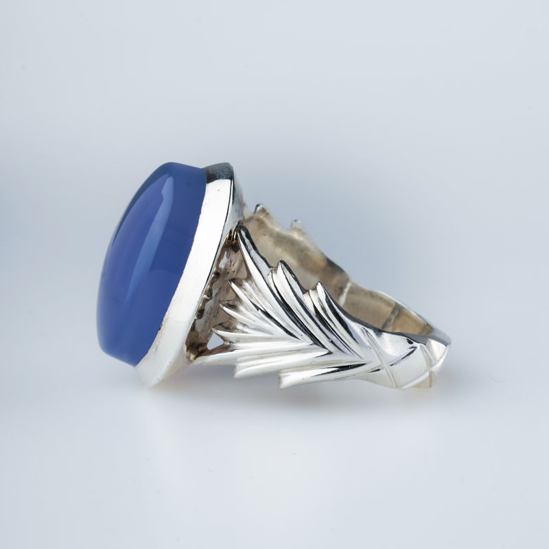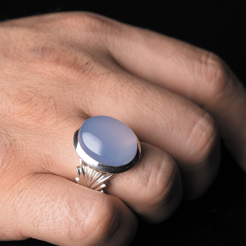نگین انگشتر عقیق زنبق شیراز، برخاسته از معادن یمن است که تراش دامله آن، جلوهای کامل از رنگ آبی کبودش را به نمایش میگذارد. ابعاد این اثر 13*17 میلیمتر است که به خوبی میتواند تمام یا بخش بزرگی از عرض انگشتان شما را پوشش دهد.