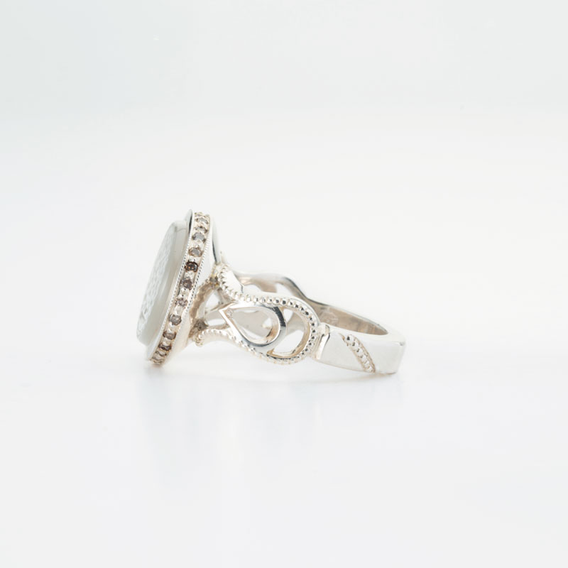 در طراحی رکاب انگشتر عقیق شاسوسا، هنرمندان مجموعه جواهرات شرافت 29 الماس اصل را در حول رکاب دورمخراج صفوی جانشانی کرده اند؛ رکابی دستساز که نقره 95 درصد آن جلوه و جلای بینظیری به الماسهای درخشان آن بخشیده اند.