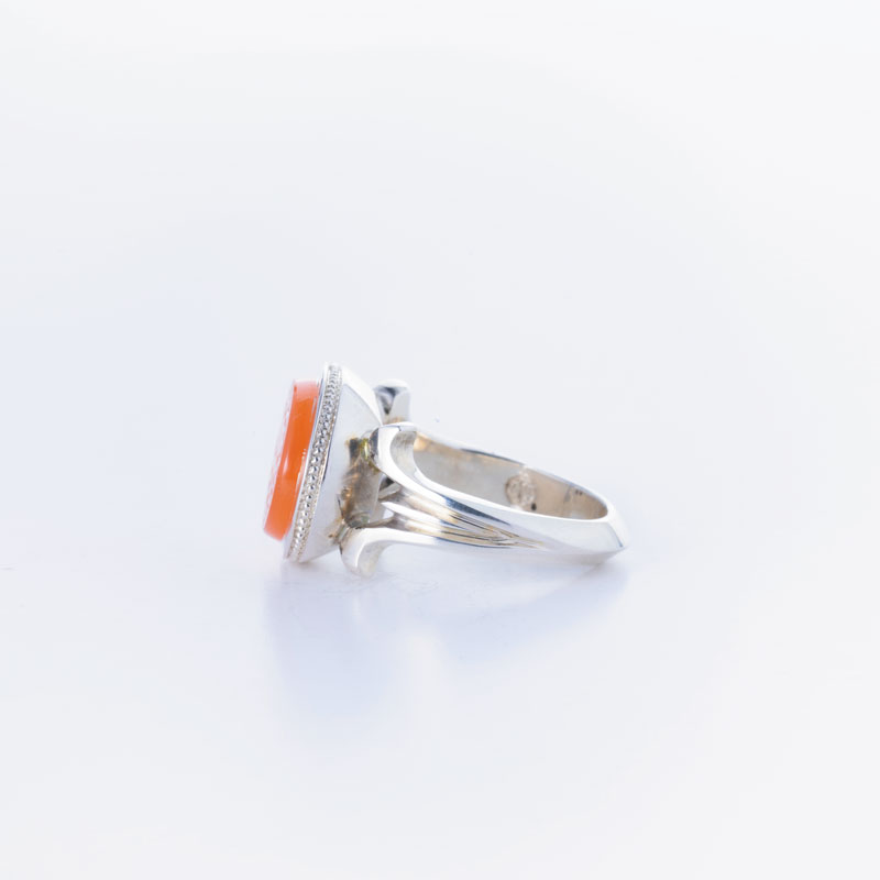 رکاب انگشتر فرهنگ، اوج مهارت نقرهسازی است. این رکاب دستساز با نقره عیار ۹۵ و به سبک مدل صفوی با طرح بسیار زیبای دو شاخ ساخته شده است. استحکام بالا و درخشش خیرهکننده نقره، این رکاب را به پایهای شایسته برای نگین ارزشمند آن تبدیل کرده است.