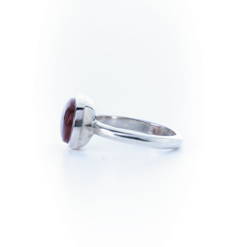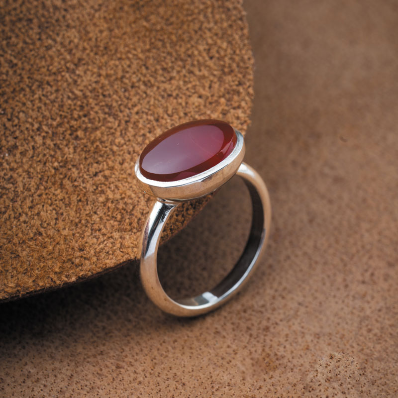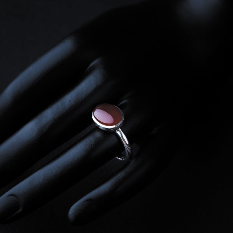 انگشتر عقیق فروغ، اثری است که مرزهای جنسیت را درنوردیده و با زیبایی کلاسیک خود، برازنده دستان آقایان و بانوان خوشسلیقه است. نگین این انگشتر، یک قطعه عقیق سرخ یمنی ناب است که با تراش دامله و رنگی گیرا و پرحرارت، نگاهها را به خود خیره میکند. تراش دامله، ابعادی برجسته و صیقلی به انگشتر بخشیده که باعث میشود نور بهشکلی رؤیایی بر سطح آن بلغزد. ابعاد نگین، توازنی عالی دارد؛ نه آنقدر بزرگ که سنگین باشد و نه آنقدر کوچک که به چشم نیاید.