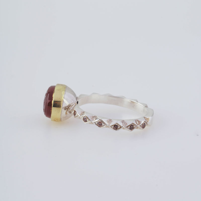طراحی بینظیر این انگشتر در مدل صفوی و قرار گرفتن عقیقی سرخ با نام متبرک یا زهرا در میانه آن، بسیار مورد پسند خانمها و کسانی است که علاقهمند به آثاری درخشان با نگینهایی متبرک هستند.