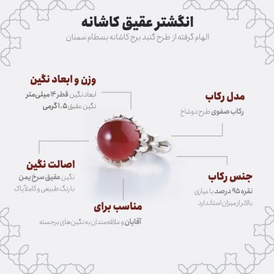 انگشتر عقیق کاشانه که نگین سرخ 1.5 گرمیاش با تراش دامله مزین شده، برج تاریخی بسطام را در ذهن آقایان تداعی میکند که معماری گنبد زیبایش، کاملاً مشابه تراش این اثر بینظیر است. این انگشتر که نگین یمنی آن در میان رکاب دستساز نقره جای گرفته، از شاهکارهای هنرمندان مجموعه جواهرات شرافت است که طرح دو شاخ رکاب صفویاش، نگین گنبدی آن را به صورتی کاملاً برجسته نمایان ساخته است. در ادامه با ما همراه باشید تا بیشتر با زوایای این انگشتر زیبا آشنا شوید.