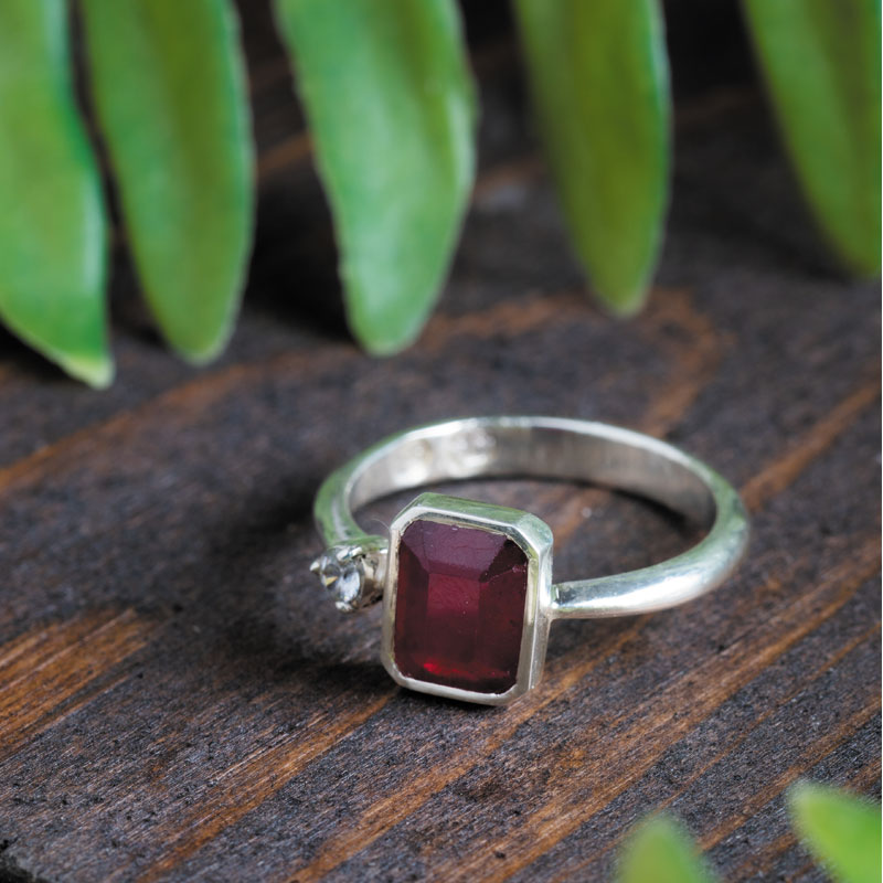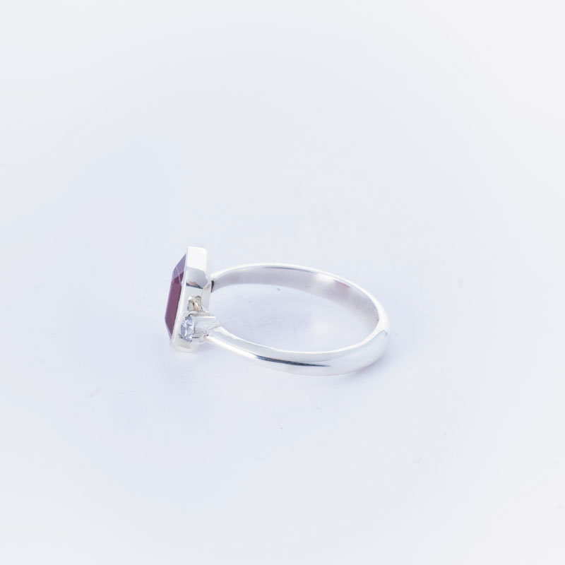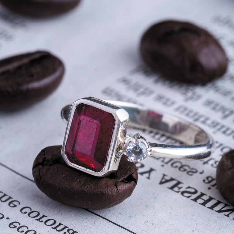 نگین یاقوت سرخ آفریقایی با وزن 1.5 قیراط، همچون قطرهای از نور در مرکز این انگشتر خودنمایی میکند. تراشهای چندوجهی هنرمندانه روی سنگ، باعث انعکاس زیبای نور میشوند و رنگ سرخ و دلفریب آن را که نمادی از عشق و شور است، بهزیبایی به نمایش میگذارند.